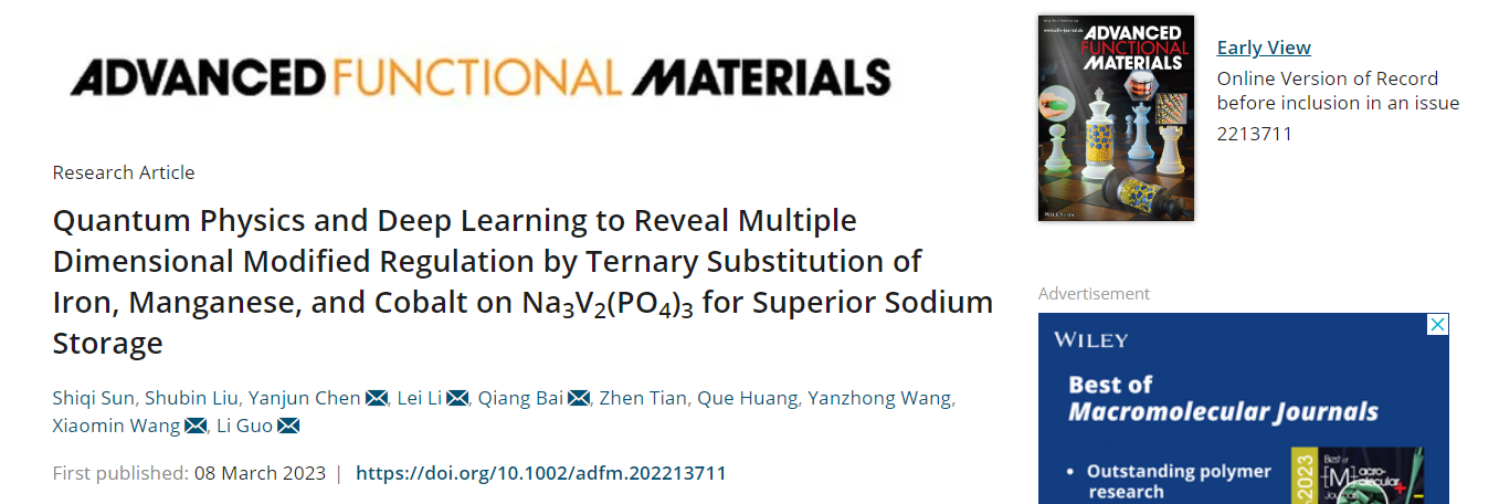 文中作者利用XRD原子占位度分析和偏态密度计算,论述了多元掺杂效应导致的惰性Na1离子的活化作用,氧空位的出现和材料禁带宽度降低的现象;同时,基于XAS测试,FDMNES结构拟合和电荷密度计算,验证了氮掺杂三原子配位环境的存在和具体结合形式,以及改性后的碳层对材料电子和离子导电性能的提升;并且通过非原位XPS光谱和不同放电过程中原子波尔磁子变化的计算结果,揭示了第二放电平台的放电顺序及多过渡金属氧化还原电对对V4+/V5+的活化作用;其次,构建了新型端到端深度学习模型,并通过少量电池运行数据作为训练集,实现了更高精度的性能预测,大大减少了时间维度上材料的测试成本。该文章发表在国际顶级期刊Advanced Functional Materials上。中北大学硕士研究生孙式琦和四川大学博士研究生刘淑斌为本文第一作者。
