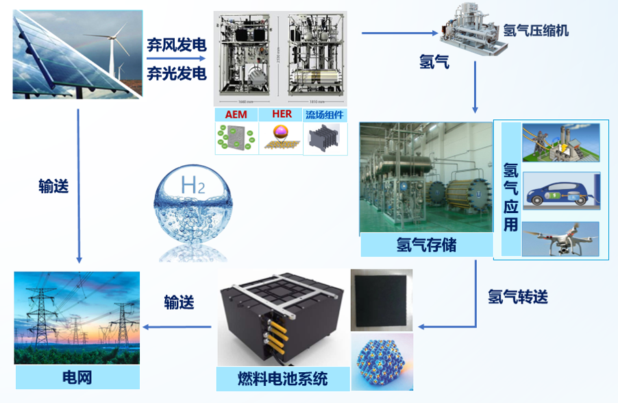 弃风、弃光电力进行水电解制氢是调节风电的间歇性、波动性的一种大规模储能技术。通过电解水制氢技术,将多余风电转化为氢能进行储存和运输,在需要的时候再通过氢燃料电池将氢能转化为电能,可以构建以氢能储能为能量转换枢纽的能源互联网,实现对可再生能源的清洁、智能、灵活、高效利用,是推动主体能源由化石能源向可再生能源更替的关键技术。